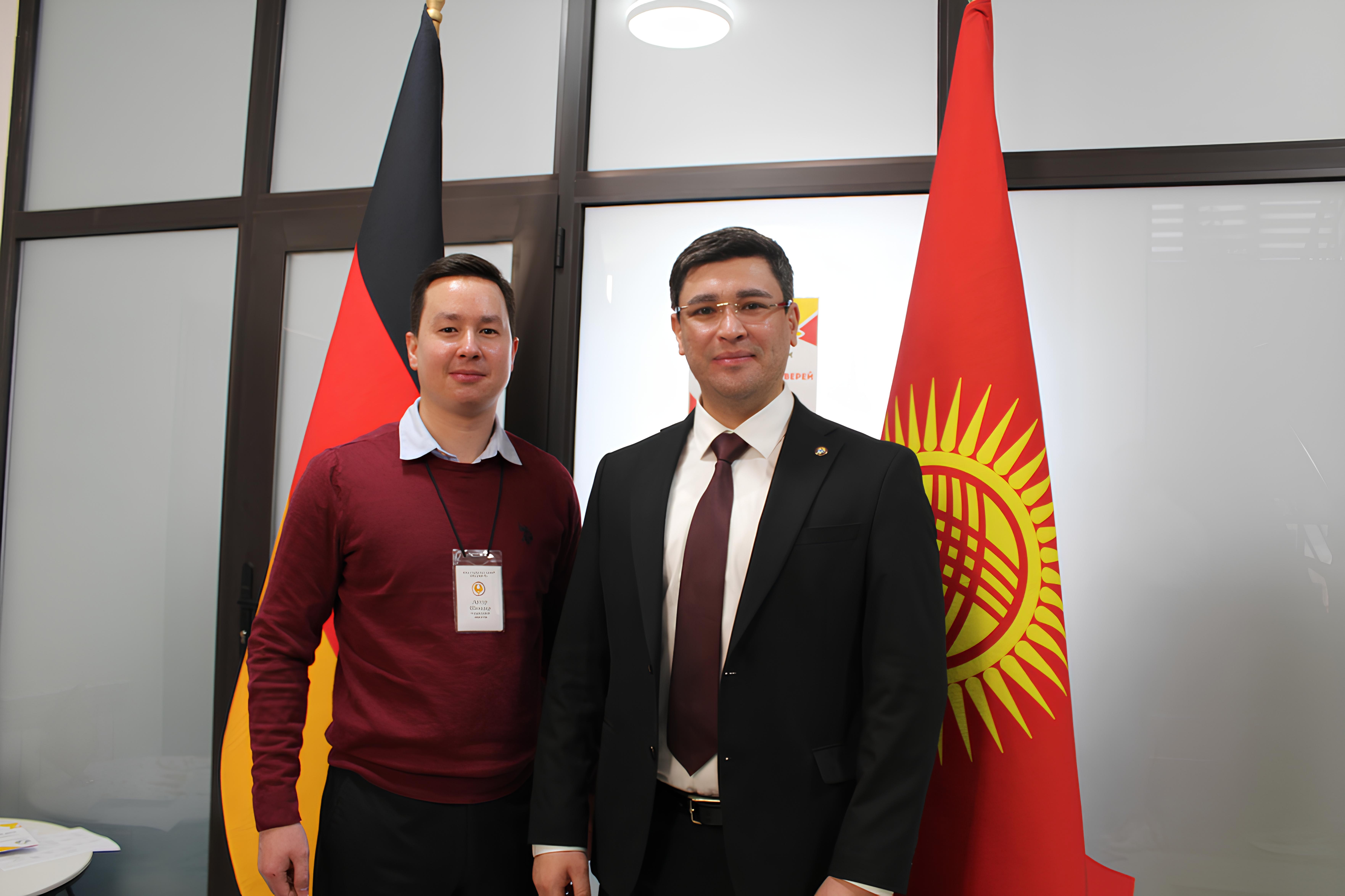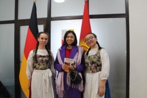 Затем студентки-практикантки из КРСУ, изучающие перевод и переводоведение, представили презентацию о выдающихся немцах Кыргызстана. Гости узнали об Алексее Штраусе – писателе и общественном деятеле Кыргызстана, о Якове Веделе – художнике, скульпторе и резчике по дереву, родом из села Рот-Фронт. Также они поделились опытом в сфере переводческого дела и возможностями в этой профессии.