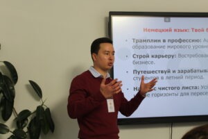 Параллельно с этой презентацией в залах проходили другие увлекательные занятия и мастер-классы. Для детей проводили урок немецкого языка Wunderkind. Маленькие посетители пели, играли и мастерили. На каждом этапе они узнавали новые слова и выражения. Взрослые практиковали немецкий с языковым ассистентом из Берлина и носителем языка Франциской. Преподаватели немецкого языка Евгения Бекерова и Бекзада Кенжебек кызы провели открытые уроки. Желающие могли выбрать подходящий для себя уровень сложности. Такой формат показал, как можно легко, доступно и интересно изучать немецкий язык. Участники погрузились в интерактивные методы обучения, которые делают процесс более разнообразным.