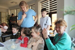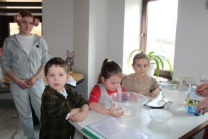 В то же время руководитель Центра встреч Бишкека – Ольга Шульц проводила кулинарный мастер-класс. Вместе с детьми и их родителями они приготовили немецкий пирог – Ривелькухен и покрасили пасхальные яйца в технике декупаж. Многие семьи заинтересовались блюдами немецкой кухни, а рецепты были для них знакомы по воспоминаниям, переданным им от мам и бабушек.